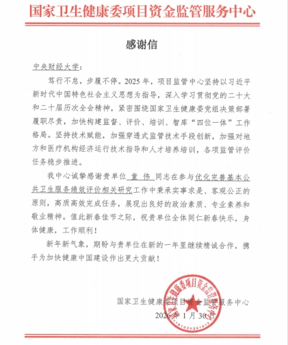 近日,国家卫生健康委项目资金监管服务中心发来感谢信,对童伟研究员在参与优化完善基本公共卫生服务绩效评价相关研究工作中的专业指导与优质服务,致以诚挚感谢和高度肯定。
